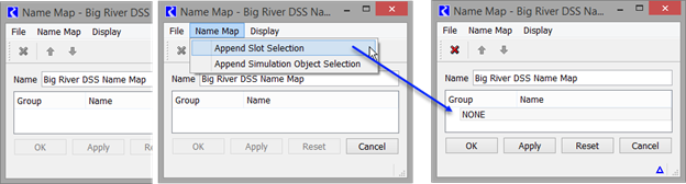 Note: For DSS datasets, there is no need to create a name map if the map is strictly to specify a different letter case; this is taken care of automatically. For example, if a reservoir is called BigLake in RiverWare and BIGLAKE in the DSS database, a name map is not necessary.