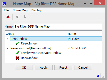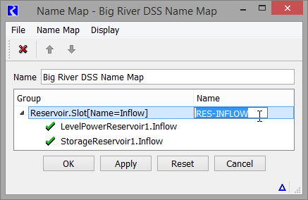 Figure 4.33, the first entry for ResA.Inflow (INFLOW) takes priority over the second entry (RES-INFLOW). The green check marks show that the first item is controlling the selection. This functionality allows you to create a name map for a generic case but redefine it in special case.
