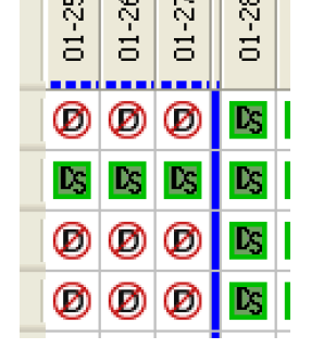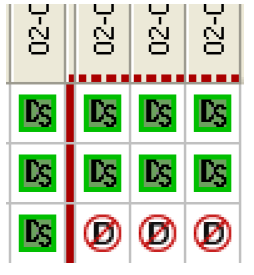 The Model Run Analysis—Simulation dialog displays the workspace-level view of dispatch conditions. This dialog consists of a two-dimensional matrix with workspace objects on one axis and model run timesteps on the other axis. The left-most part of the matrix, separated by a blue vertical line, indicates prerun timesteps. Post-run timesteps (when configured) are shown separated by a red line. Each cell in the matrix shows the dispatch state of an object at the indicated timestep. Dispatches are registered automatically during model runs; dispatch information is displayed when available. Because they never dispatch, Data Objects and Snapshot Objects are not included in the list of Objects.