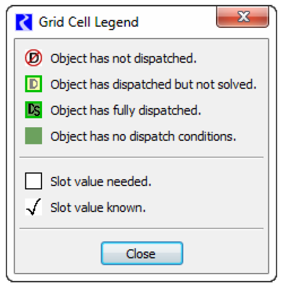 Selecting an Object or timestep cell displays its dispatch state in text form at the bottom of the Dispatch Information dialog. If the Object dispatched at that timestep, then the name of the method under which it dispatched is also displayed.