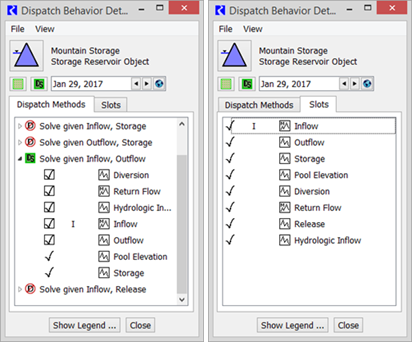 Note:  All the slots are checked as known, even those required to be unknown. This occurs because the object solved correctly for all slots, making them known by the end of the timestep. We know that the dispatch conditions requiring unknowns were met at the time of dispatching because the method could not have dispatched otherwise. This may seem slightly confusing, but remember that the known/unknown status of particular slots is truly of interest only if the object failed to dispatch at the selected timestep. If the object did indeed dispatch, all of the conditions must have been met.