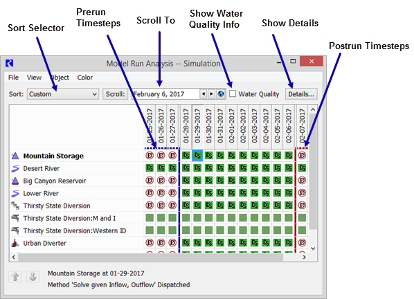 Timesteps before the start timestep are displayed with a blue dotted line below and to the right of the timestep label. Also, there is a blue separator line between the initial and start timestep. Only certain objects (reaches, confluences, control points, and stream gages) dispatch during prerun timesteps,. Thus, most objects indicate they have not dispatched during the prerun period.