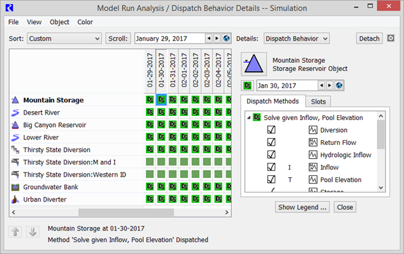The Model Run Analysis utility provides post-run diagnostics regarding object dispatching and known values of dispatching slots at every timestep of the simulation. The Model Run Analysis dialog is invoked by selecting Model Run Analysis from the Utilities menu or by selecting the Run Analysis shortcut button on the toolbar.