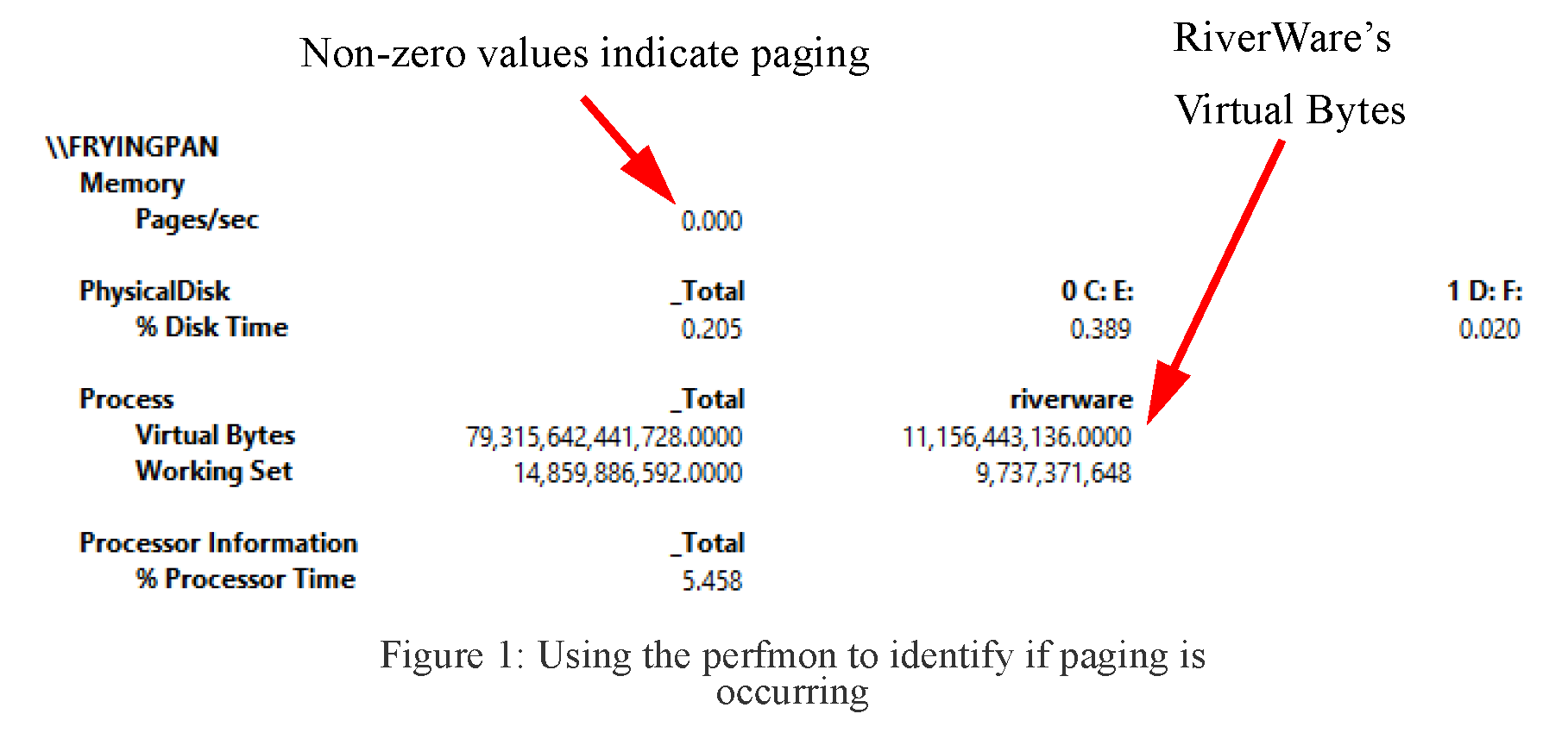 How much RAM do you need? If your model/computer consistently utilizes 11 GB of memory, then make sure you have at least 12 GB of RAM available for it, and preferably more. Adding enough RAM will ensure that all the required memory used will indeed be used from the RAM, and not supplemented by paging. To determine how much memory is used during a model run, look at the perfmon utility. Under the Process, Virtual Bytes entry, it shows the number of bytes used by the riverware process. This is the total space that RiverWare is using. To fit RiverWare completely in memory, the amount of RAM should be larger than this plus enough for the operating system.