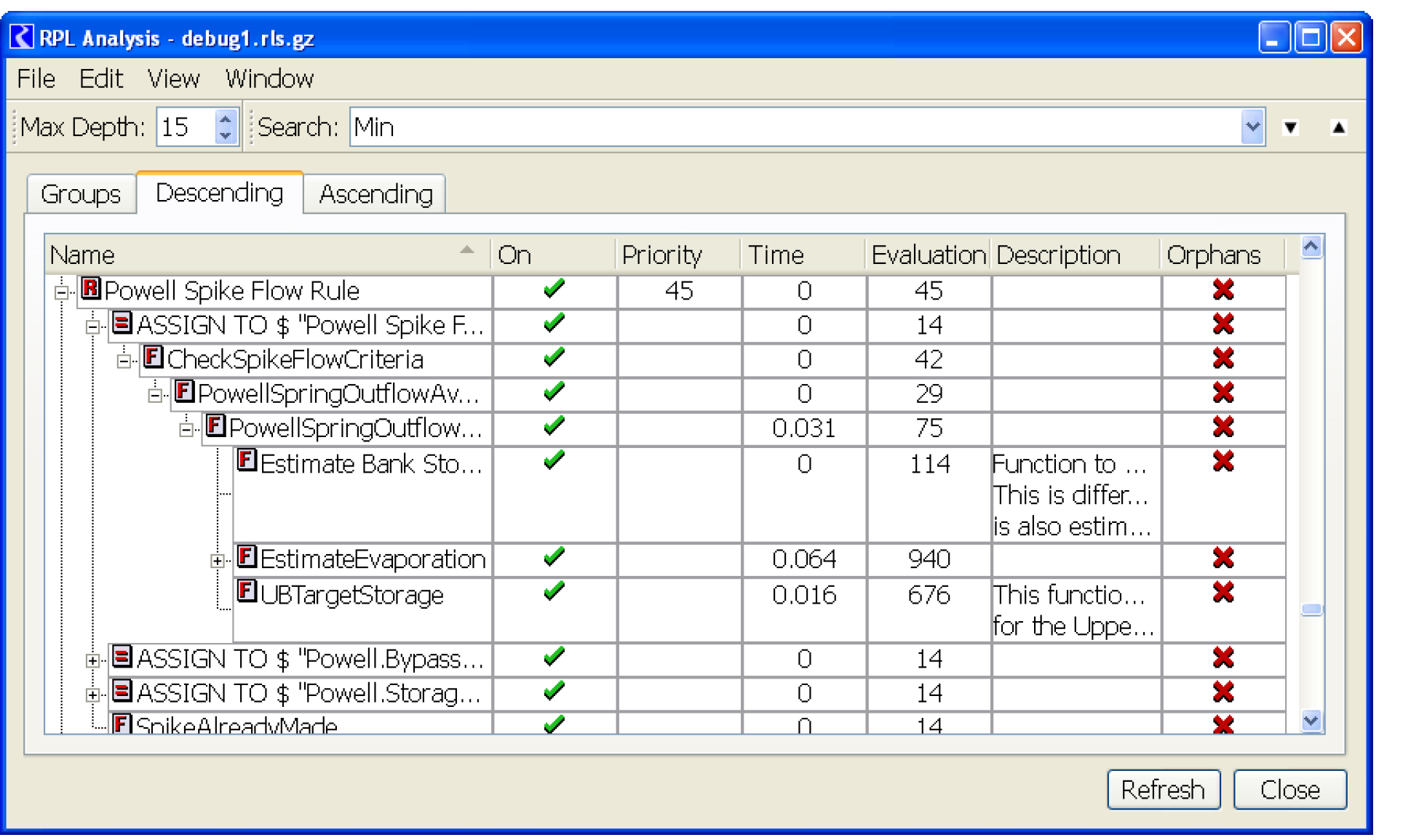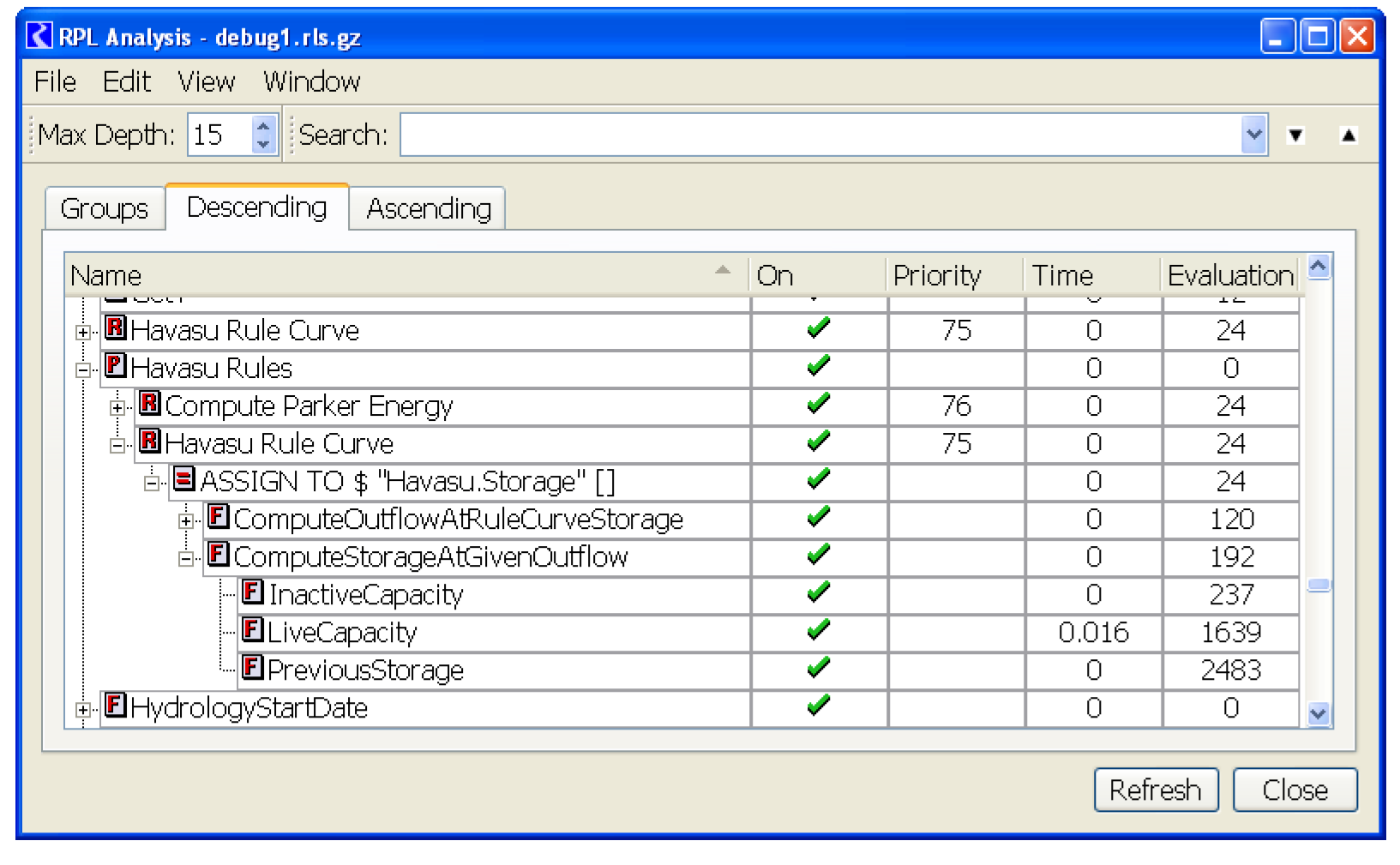 The RPL Analysis Dialog is available for each of the RPL sets in RiverWare including rulesets, object level accounting method sets, expression slot RPL sets, iterative MRM rulesets, and RPL based optimization sets. In this document, a block refers to the upper level expression for each of these sets and will be used in all descriptions. A block is analogous to such items as a rule, method, or expression slot assignment.