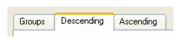 The user can switch between views by selecting the desired tab: Groups, Descending, or Ascending. In addition, the View menu provides menu items and key-commands for rapidly switching between views: View, then Groups View or Ctrl+G, View, then Descending View or Ctrl+D, View, then Ascending View or Ctrl+A.