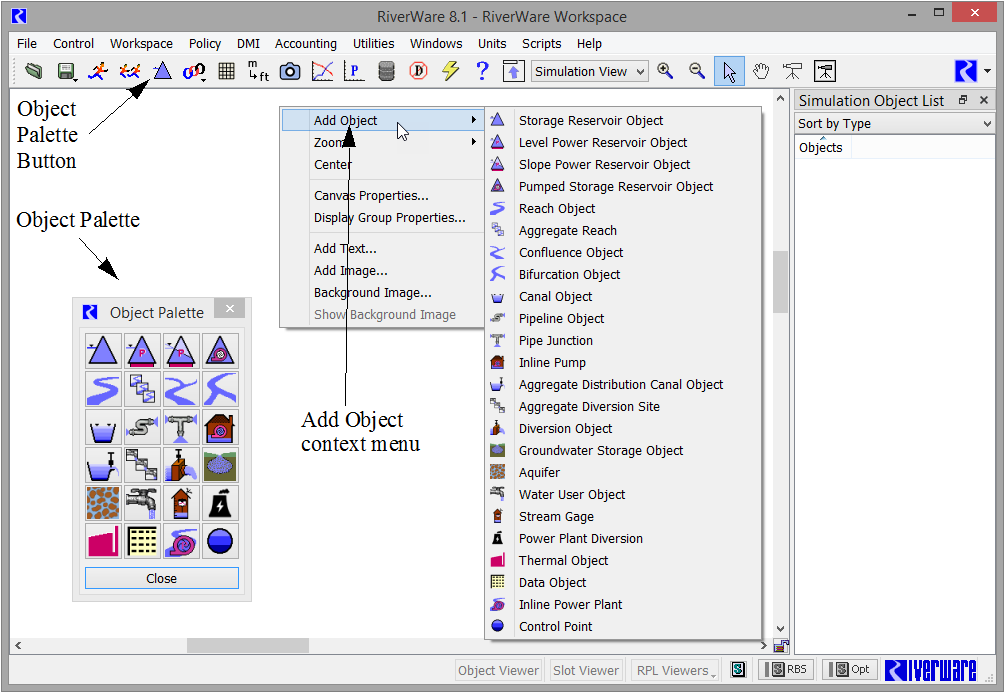 Figure 1.2 Methods of adding objects on the RiverWare workspace
