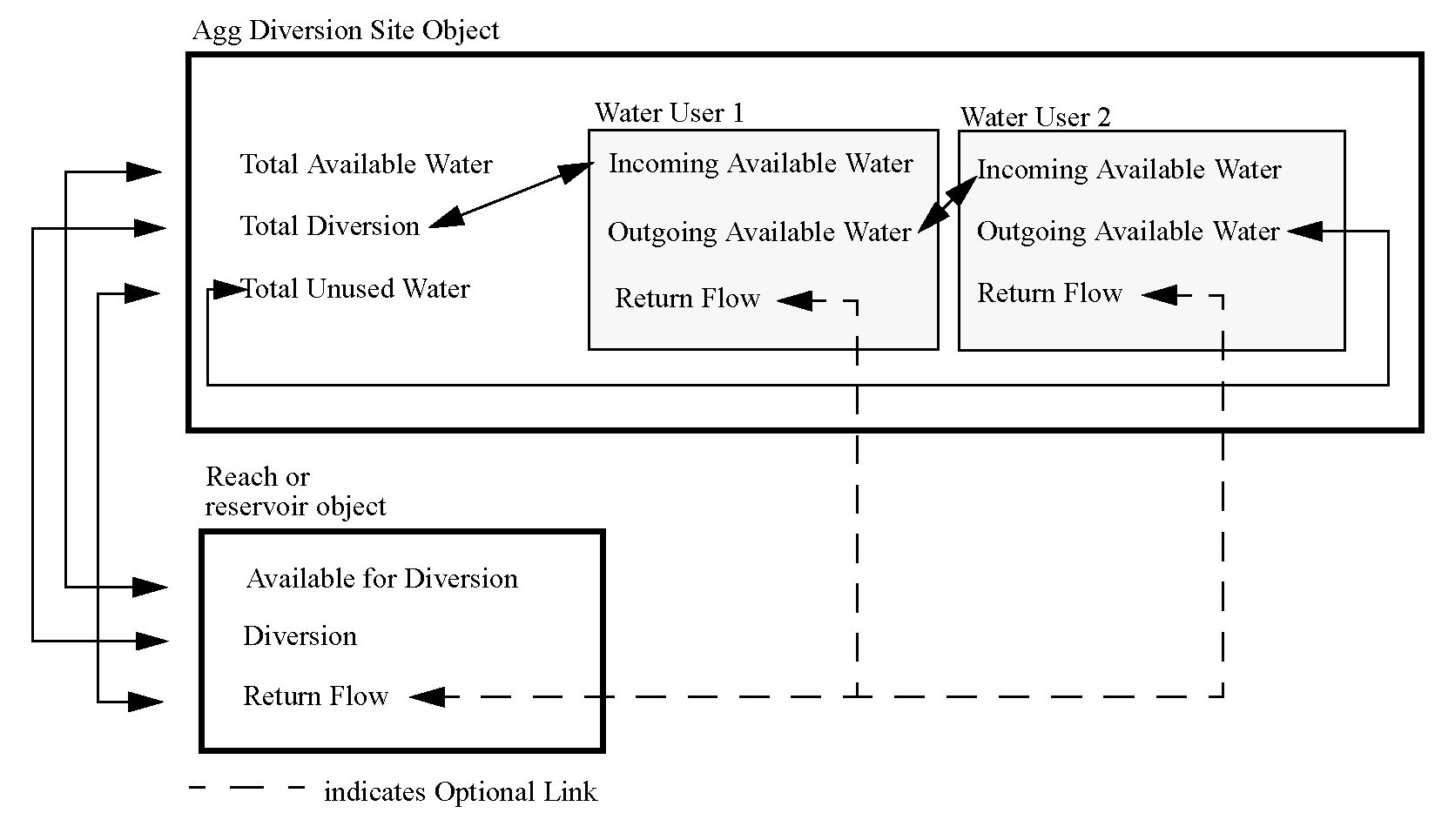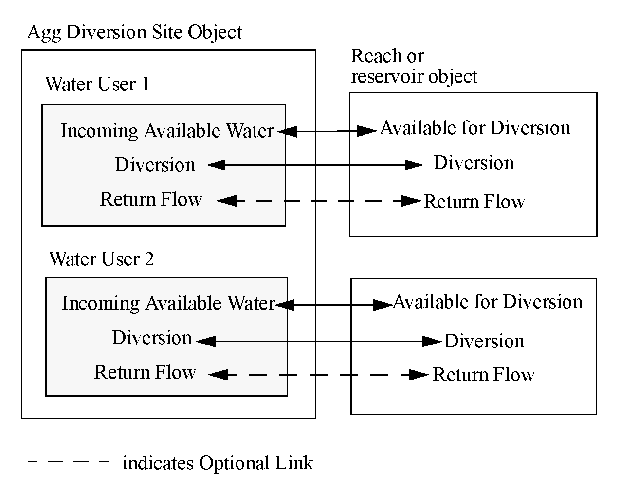 The Agg Diversion Site diverts a bulk amount of water, from a reach or reservoir, and passes it to the first Water User, who takes its requested amount, if possible, and passes the remaining water on to the next user. In this way, the junior users may get only part or none of their requested amount. Excess is returned to the Agg Diversion Site, via the Total Unused Water slot. Each water user processes its delivered amount, and all return flows are handled on a per-Water User basis; that is, each Water User links its returns back to the river individually.