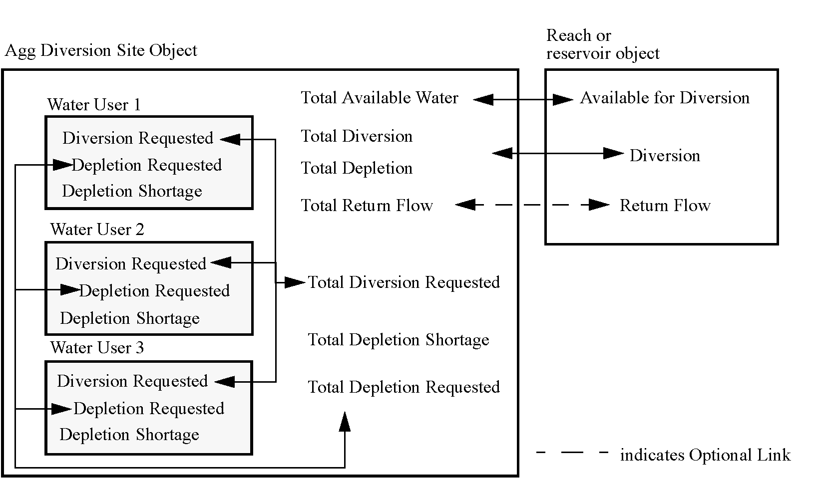 It is not necessary to use Water User elements with this linking structure. If desired, Total Diversion Requested and Total Depletion Requested can be input directly by the user. However, it is often desirable to use one or more Water User objects for this purpose.