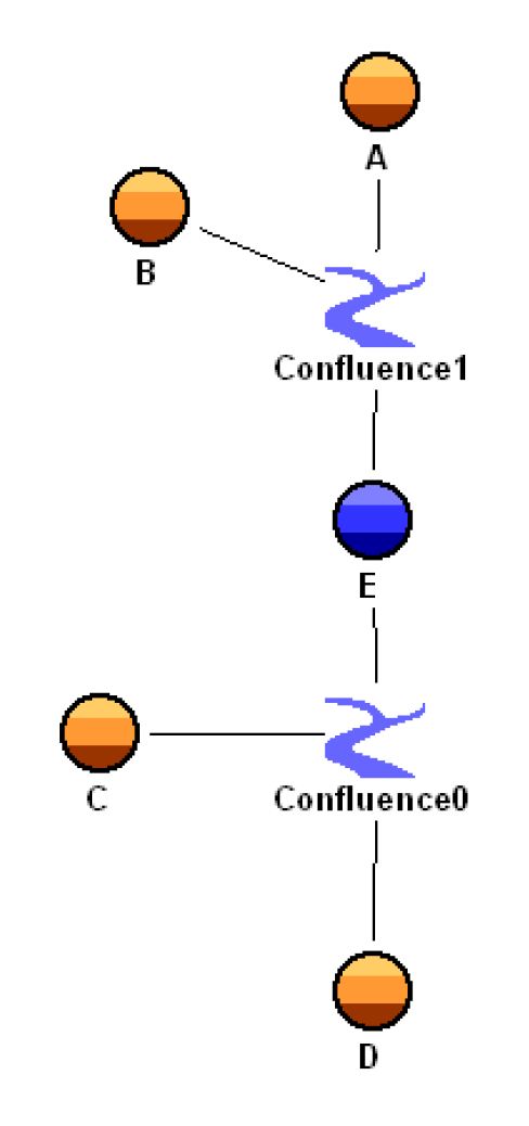Information: Used in the Spatial Disaggregation method on the computational subbasin. This list is set on un-gaged control points using the WAM Curve Number method or the Drainage Area method. For most un-gaged control points, this list is empty. When the list is used, it specifies which gages should be lumped into the gain for its downstream gage control point. Include only gages that are tributary to the downstream gage but are not tributary to the un-gaged control point. For example, ungaged control point E excludes gaged control point C in its calculation.