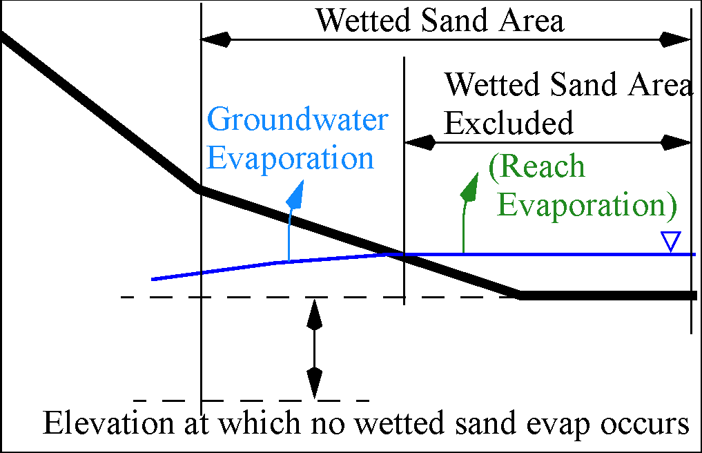 This method was designed to work with a connected Reach object where the reach computes its Surface Area (see Pan Evaporation) and then propagates the value to the Wetted Sand Area Excluded. In this linking approach, evaporation from the water surface comes from the Reach while evaporation from the wetted sand comes out of the groundwater.