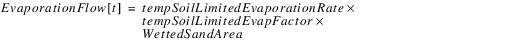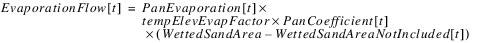 3. If the Soil Limited Evaporation Elevation is valid, the Elevation Previous is less than or equal to Soil Limited Evaporation Elevation, and the Wetted Sand Area Excluded is equal to zero. Then the previous Elevation is looked up on the Soil Limited Evaporation Rate periodic slot to get the soil limited evaporation rate that would occur on that date. This is stored as a temporary variable tempSoilLimitedEvaporationRate. Also, the previous Elevation is looked up on the Elevation Evaporation Factor Table to get the fraction of Soil Limited Evaporation Rate that occurs at that elevation. This is stored as a temporary variable tempSoilLimitedEvapFactor. The evaporation (flow) is computed as follows: