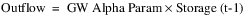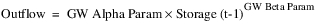 The exponential term is computed in user units. That is, Storage(t‑1) is converted to user units, raised to the power of GW Beta Param, and then converted back to the standard RiverWare units before being multiplied by GW Alpha Param).