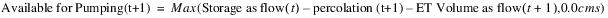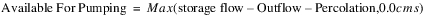 If Available For Pumping is not input by the user, it is calculated from the previous timestep’s storage and the current timestep’s outflow and percolation. A local variable, storage flow, is calculated as the previous timestep’s Storage value divided by the length of the current timestep. This represents the flow rate required to drain the groundwater of all its stored water in the current timestep.