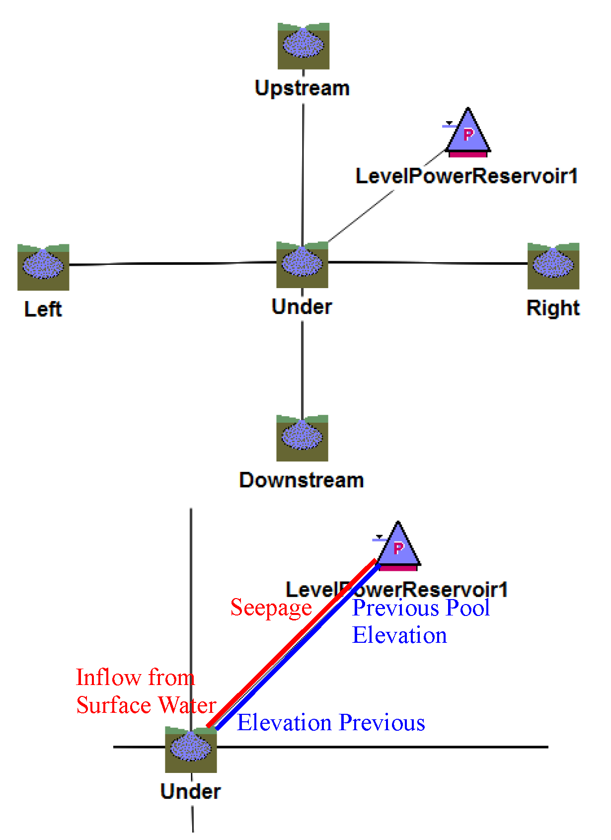 Figure 15.5. The object Under would have the Head Based Boundary Condition method selected for the Solution Type and is used to convey the Seepage from the Reservoir to the laterally linked Groundwater objects. The laterally linked Groundwater objects would have the Head Based Groundwater Grid method selected for the Solution Type. There may be 1-4 laterally linked Groundwater objects. The appropriate Elevation Previous and Flow Factor slots should be linked between the Under Groundwater object and the laterally linked Groundwater objects. The linking with the Reservoir object is illustrated in