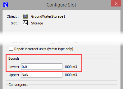 If the computed Storage is less than the lower bound, a warning message is posted but the run is not stopped. The lower bound is specified on the Storage slot, using the View and then Configuration menu. See Figure 15.6. If no lower bound is specified, a value of zero is used, to match historic results.
