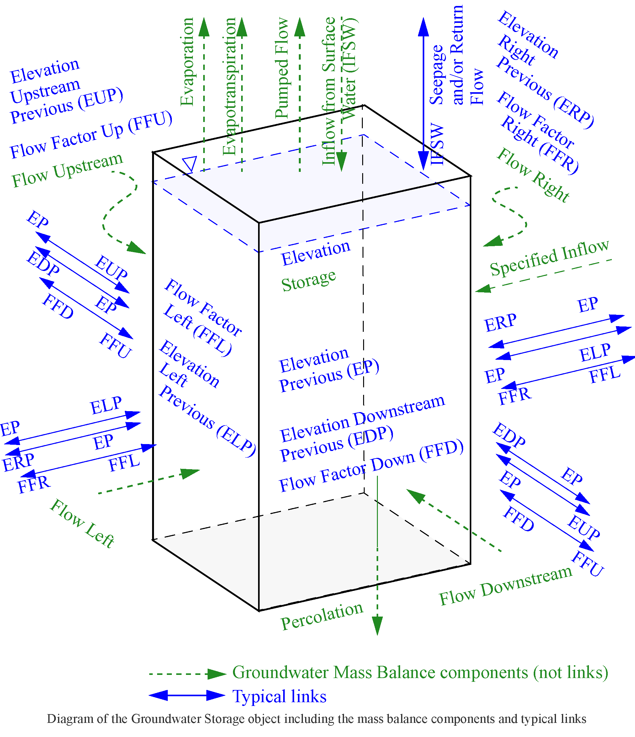 Figure 15.7  Groundwater Storage object, including the mass balance components and typical links