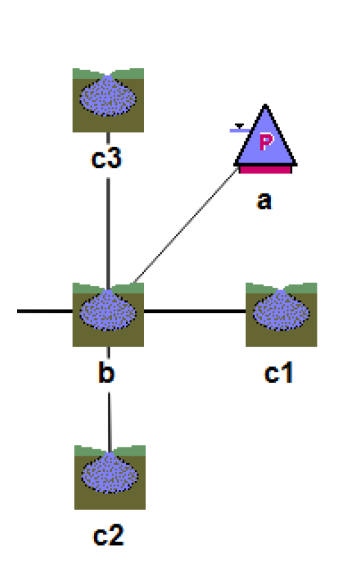 On the first timestep, the c1‑c4 get an Inflow from Surface Water and solve for Storage and Elevation given Elevation Previous values. Also, b solves given Elevation Previous which came across the link from the Reservoir as set on the Reservoir during initialization. A new Inflow from Surface Water is computed for b and propagates to the Reservoir.Seepage. The Reservoir dispatches once it has enough information and solves for Storage and Pool Elevation at t and sets Previous Pool Elevation at t+1. This propagates to Elevation Previous on b at t+1, which in turn propagates to Elevation Upstream/Downstream/Right/Left Previous on c1-c4 at t+1. This allows c1-c4 to solve at t+1, and b also solves at t+1 for Inflow from Surface Water. This linked value provides Reservoir.Seepage for the next timestep. The process continues through the run where the c1-c4 and b solve one timestep before the Reservoir is able to solve.