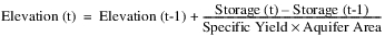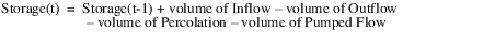 Percolation (if applicable), Outflow, and Pumped Flow (if applicable) are then converted to volumetric values by multiplying them by the length of the timestep. Storage is then calculated using the following mass balance equation: