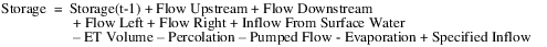 The groundwater flow, percolation, Inflow from Surface Water, Specified Inflow and pumped flow terms in the above equation are actually the volumes associated with those flow rates (flow rate multiplied by timestep length). Some of the terms may not be active depending on method selection (that is, ET Vol, Percolation, Pumped Flow).