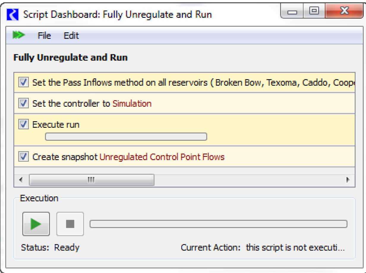 This approach assumes all reservoirs are unregulated. If only a portion of the system is unregulated, then you will need to decide how the other reservoirs behave, especially if they are dependent on the disabled reservoir. Additional script actions can be used to disable rules or set values in the system. See
