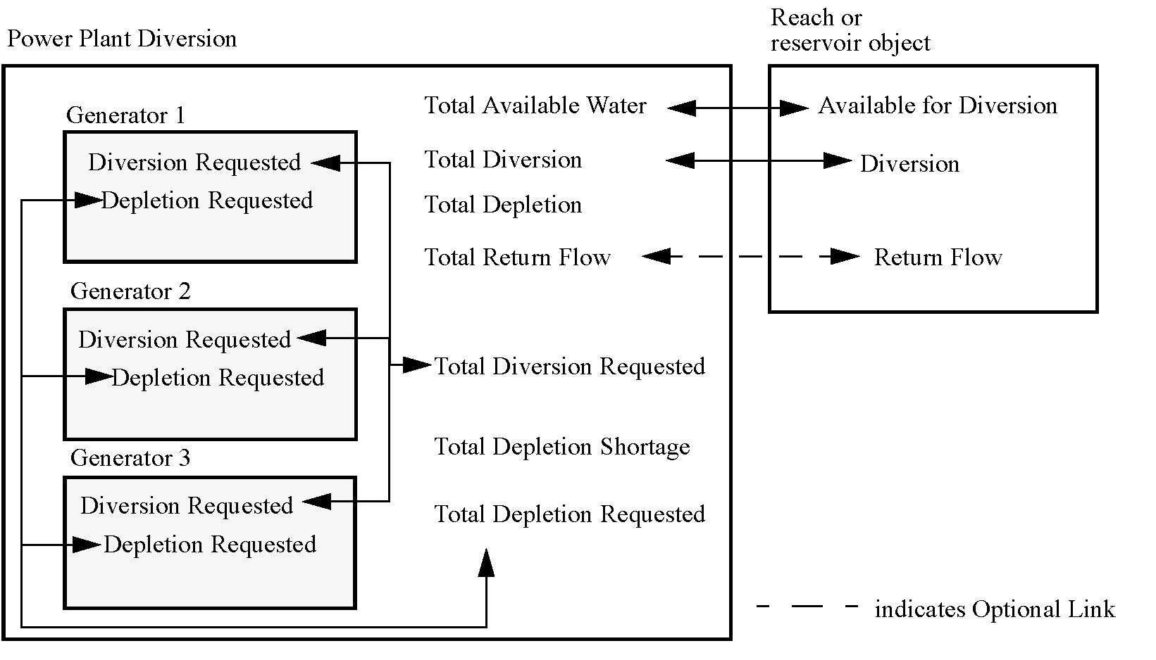 A Power Plant is a collection of individual Generators; see Generator for details. A single diversion is used to serve all generators in the plant. Thus, the plant-level computations divert water from a reach or reservoir to meet the Total Diversion Requested limited by the Total Available Water. The plant also computes the depletion and consumption of water and diversion and depletion shortage. If there is a shortage, then there is no need to allocate that shortage to individual generators. Figure 21.1 illustrates.
