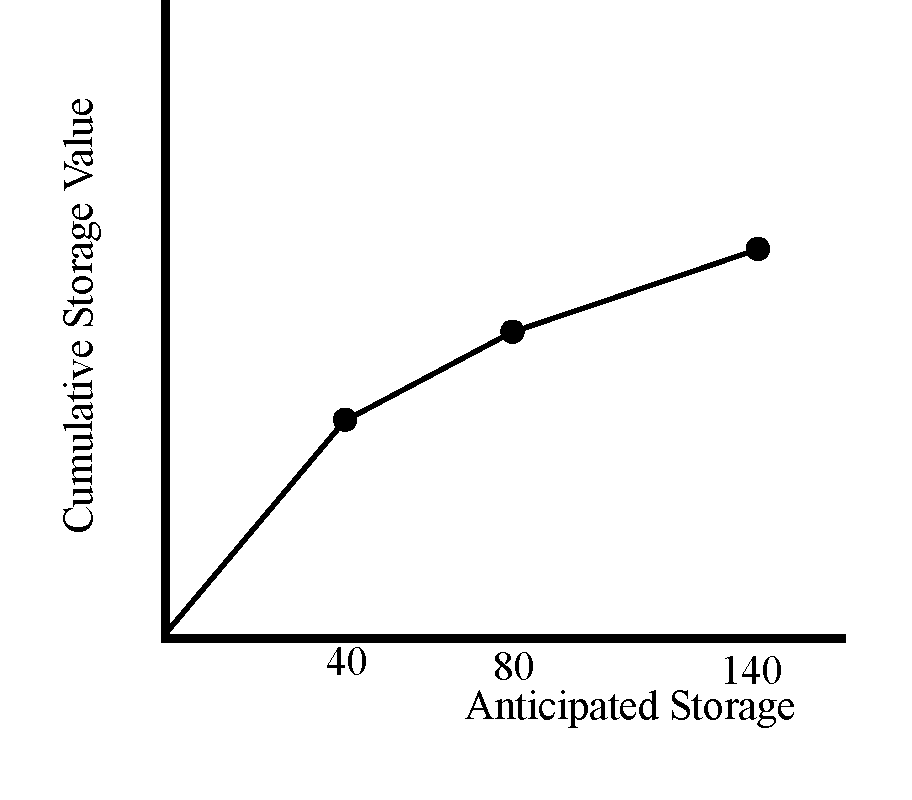 If only one value exists in the Marginal Storage Value Table, then only two entries will exist in the Cumulative Storage Value Table. The two entries will be 0, and midway between the value in the Marginal Storage Value Table and the maximum value set on the Storage slot. If more than one value exists, three or more points will result. Following is an example Marginal Value Table (Table 22.1), the resulting Cumulative Storage Value Table (Table 22.2), and a graph of the Cumulative Storage Value data.