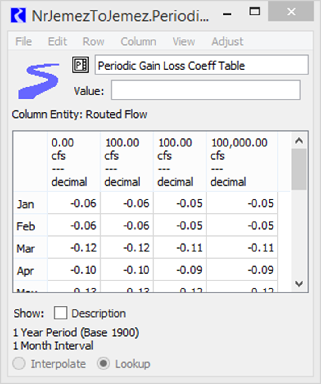 Information: Data must be entered in blocks of increasing flow for each given day for the interpolation method to work correctly. January 1 is represented by a 1, February 1 as 32, and so on. The table is set up in the same manner as the Interpolated GainLoss Coeff Table (shown above).