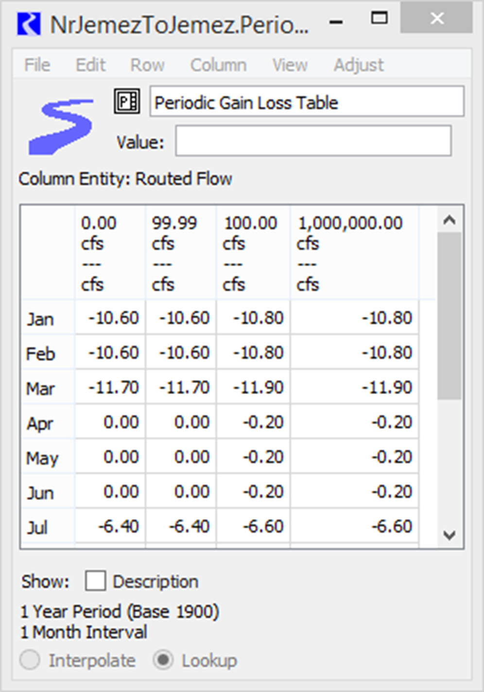 This method is used to model gain and/or loss in a reach. The gain and loss values are entered as periodic data for a given time range. Gains are entered as positive values and losses are entered as negative values. This method will be available for all Routing methods except Time Lag routing.
