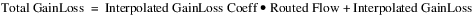 A 3‑D interpolation method is used to calculate a value for Interpolated GainLoss and Interpolated GainLoss Coeff using the Interpolated GainLoss Table and Interpolated GainLoss Coeff Table, respectively. Once these values are calculated Total GainLoss is set as follows: