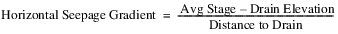 The Horizontal Gradient Seepage method requires that a Stage method be selected. It also has a dependent method category, the Drain Elevation method category. The reach horizontal bank seepage area through which seepage can flow to each drain in the horizontal direction is calculated using a stage/bank seepage area table interpolation. The horizontal hydraulic conductivity of the medium adjacent to each drain is entered by the user. The horizontal seepage gradient for each drain is calculated using the following equation: