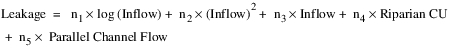 where n1, n2, n3, n4, and n5 are coefficients held in a table slot. For the Leakage calculation, if the inflow value is negative, it will be assumed to be zero.