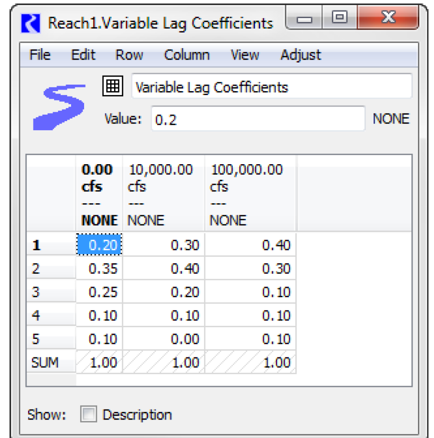 Note:  The storagetime calculation is always made with meanfl in units of cfs regardless of the user units on any flow slots. The values in the Variable Storage Time Coefficient Table and Variable Storage Time Exponent Table should be set accordingly.