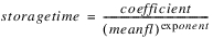 where storagetime is the time of storage in hours; coefficient and exponent are user input constants in the slots above; and meanfl is the average interior flow of the previous timestep.