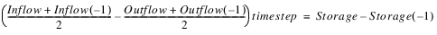 The Modified Puls algorithm solves for the Reach Outflow given current and previous Inflow and Storage values using the following continuity equation, as follows: