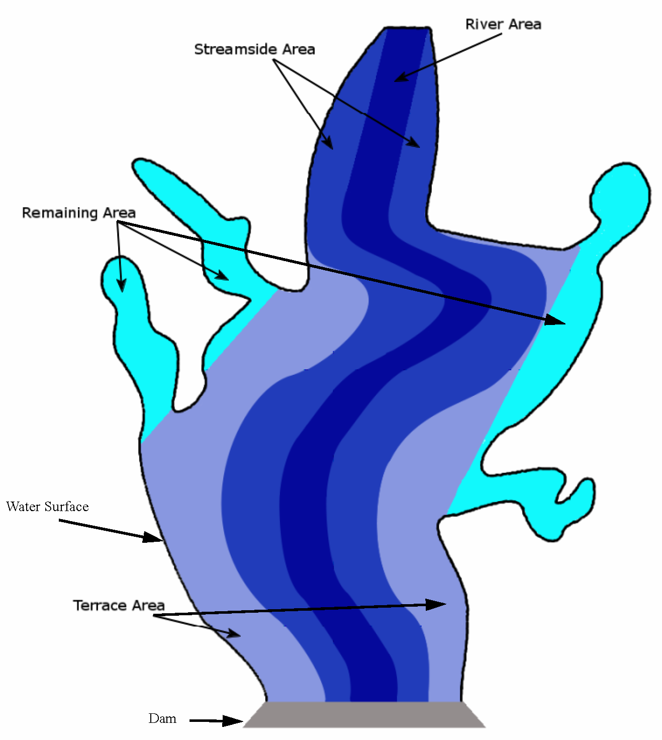 Each can have a separate evaporation coefficient and possibly additional components in its computation like temperature. The area of each region is specified in a separate table relating reservoir pool elevation to each region’s area. It is assumed that any precipitation that falls on the Remaining Area would have completely evaporated. The figure shows a sample of the different reservoir areas used in this method.