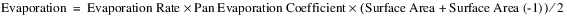 The Surface Area is determined using the Pool Elevation and the Elevation Area Table. The Evaporation Rate is looked up in the Evaporation Table according to the current day of the year. Evaporation is calculated using the following equation: