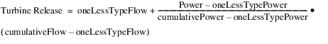 In order to compute the Turbine Release associated with the known Power, the method begins to add entire unit types (operating according to the best power and flow tables and beginning with the most efficient type) until the Power is exceed or all the unit types have been added. If the Power is exceeded, the last generator type is interpolated to compute the Turbine Release exactly (see equation below). However, if all the unit types have been added and the Power cannot be met, the method assumes all unit types are operating at full capacity (according to the Full Generator Flow and Full Generator Power tables). Then if the Power is exceeded, the last generator type added is interpolated to compute the Power exactly (see equation below). However, if the Power still cannot be met, an error is posted and the run is terminated because the generators are unable to produce the amount of Power specified by the user.