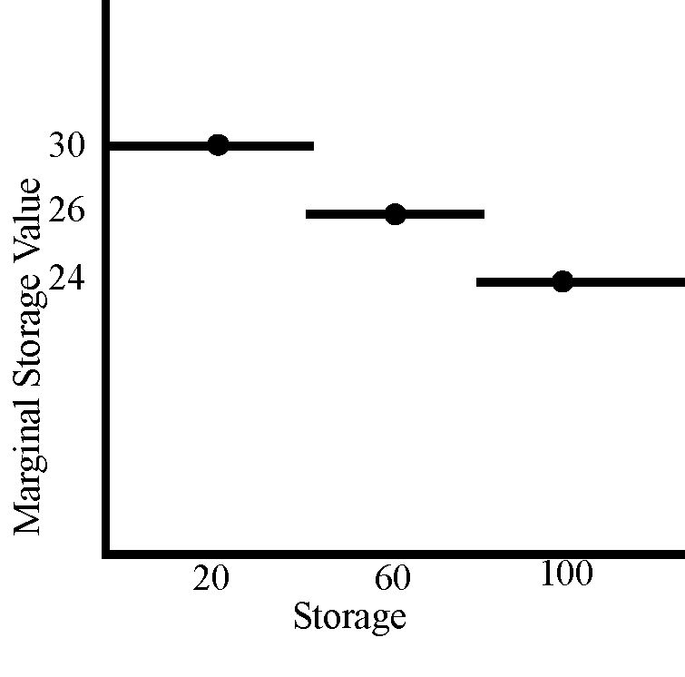 Assume that the current storage is 39. Therefore, this method would use 30 as the marginal value for use in the next computation. Assume that the current storage is 41. Therefore, this method would use 26 as the marginal value for use in the next computation.