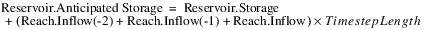 The Cumulative Storage Value computation begins by first calculating Anticipated Storage. This is the sum of the reservoir Storage plus any flow already in transit to the reservoir in an upstream lagged reach. For example, assume a reservoir’s Inflow slot is linked to a reach with a 3-hour lag time. In an run with a 1 Hour timestep, the reservoir’s Anticipated Storage would be calculated as follows: