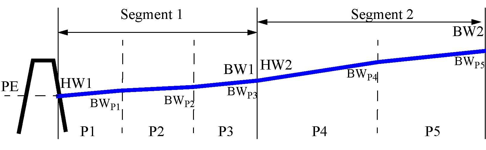 The partitions are the areas between the breaks, as noted above. For the first partition, P1, the headwater at the dam will be utilized in conjunction with the flow parameter calculated for P1 in a 3‑D table interpolation from the user input Partition B W Table to find the BW elevation (at the upstream end) of P1. The headwater elevation at the dam PE/HW1 will also be used to calculate the BWP1, BWP2 and BWP3. P3 also constitutes the end of segment 1. Thus, HW2 is set to BWP3.Then, HW2 is used to calculate BWP4. HW2 will be used to find the BW elevations for each partition in segment 2. The BW elevation of the last partition in a segment is the HW in the next segment and will be used to calculate all the BW elevations of all the partitions in the segment.