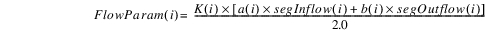 where i is the reservoir segment. K(i) is a calibration parameter dependent on previous Storage. segInflow(i) and segOuflow(i) are the calculated inflow and outflow of each segment and are local variables. Weighting factors, a(i) and b(i), determine to what extent Flow Param depends on the inflow and outflow of the segment.