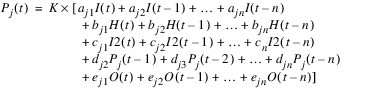 The partition flow parameter Pj(t) is calculated at each partition j, where the time t ranges from the current timestep to some previous timestep n as follows: