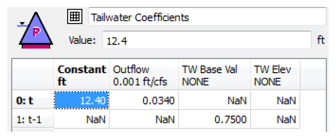 Information: Not every cell will have a value, but there must be at least one value in the table. In addition, the coefficient for TW Elev at t cannot be non-zero or an error will be issued. (Tailwater Elevation at the current timestep is the value being computed, so it is not possible to use it in the calculation). If any coefficients are specified (non-zero) for t-1 for Outflow, TW Base Val, or TW Elev, then the initial timestep value of those slots must also be specified.