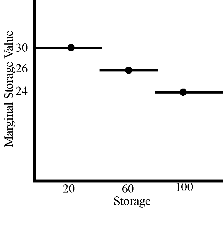 Assume that the current storage is 39. Therefore, this method would use 30 as the marginal value for use in the next computation. Assume that the current storage is 41. Therefore, this method would use 26 as the marginal value for use in the next computation.