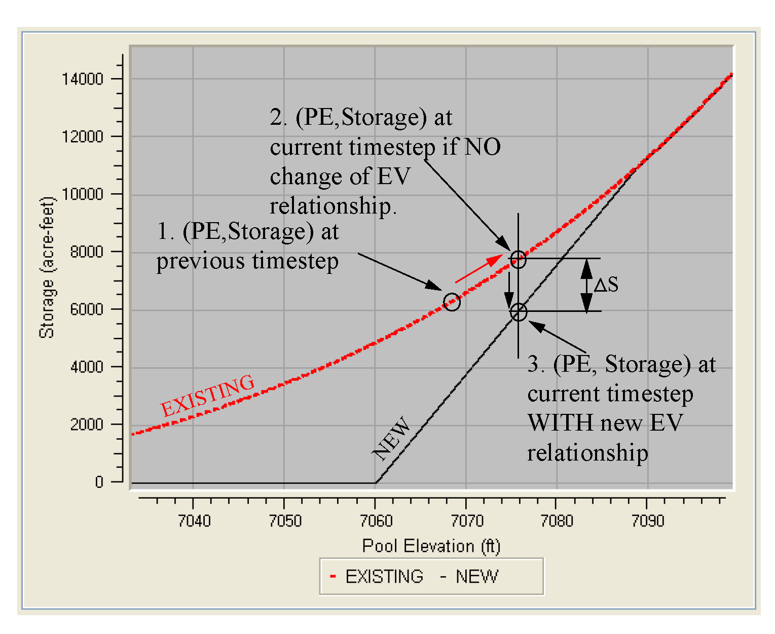 In Figure 25.2, both the existing and new EV relationships are plotted. Shown is a graphical example of how the mass balance should be performed on the timestep the EV relationship changes.