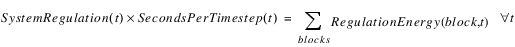 The energy in the regulation blocks is constrained to equal the total system regulation (converted from power to energy by multiplying by the timestep).
