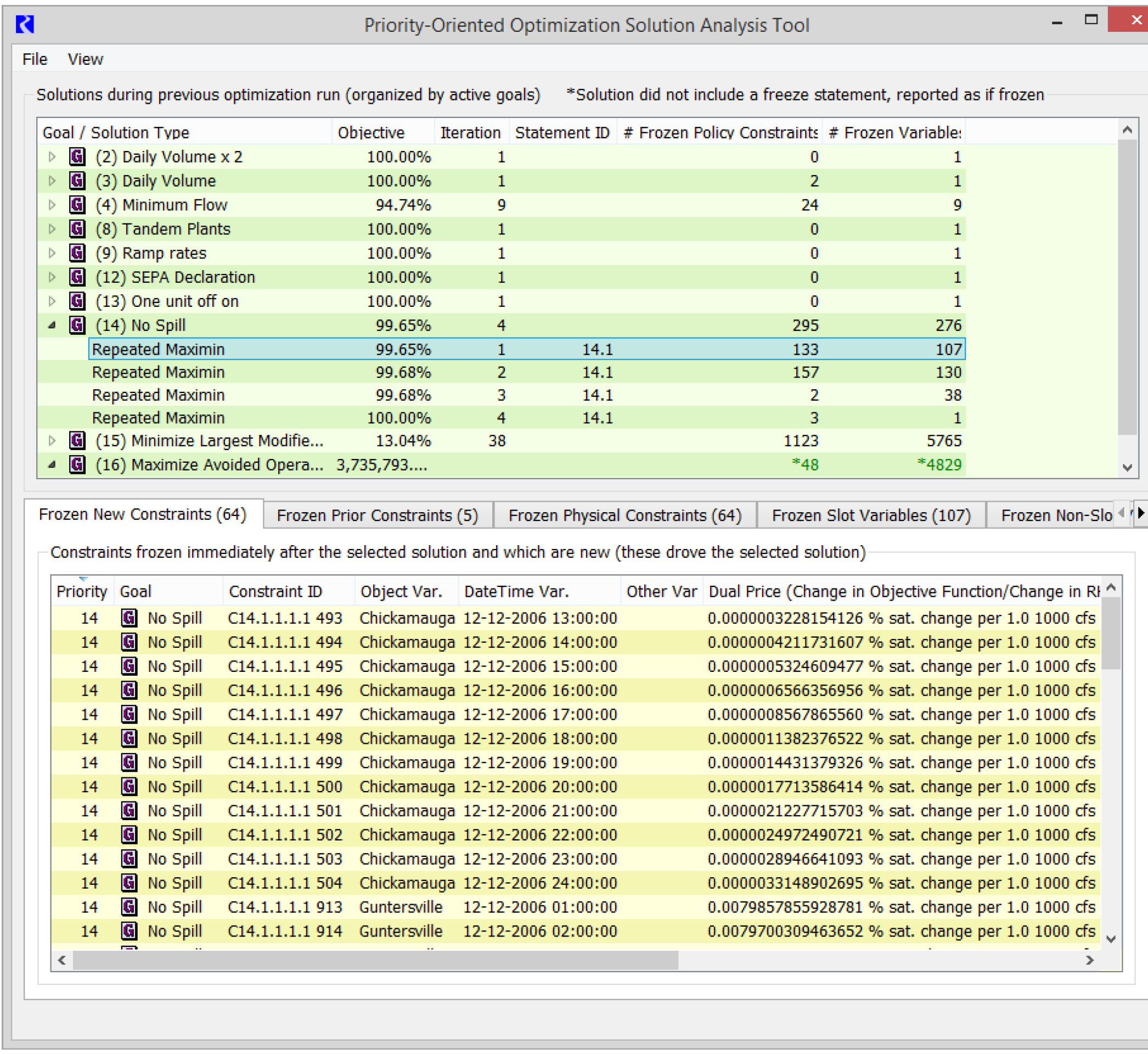 This information is valuable for understanding the optimization solution. For example, observing which constraints were frozen immediately after a given solution indicates which policies were driving the solution. Information from the tool can also be helpful for debugging problems with an optimization run. For example, constraints that were frozen when not expected can at times indicate policy in the goal set that is having unintended consequences.