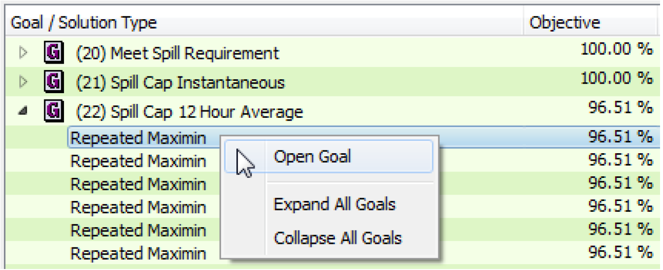 The Solution Information Panel presents an overview of the optimization solution. The top level displays the active goals in the loaded goal set, in priority order. Clicking on the arrow at the left of each these goal rows will expand the row to display information about each solution corresponding to that goal (a solution row). See Table 7.1 for details.