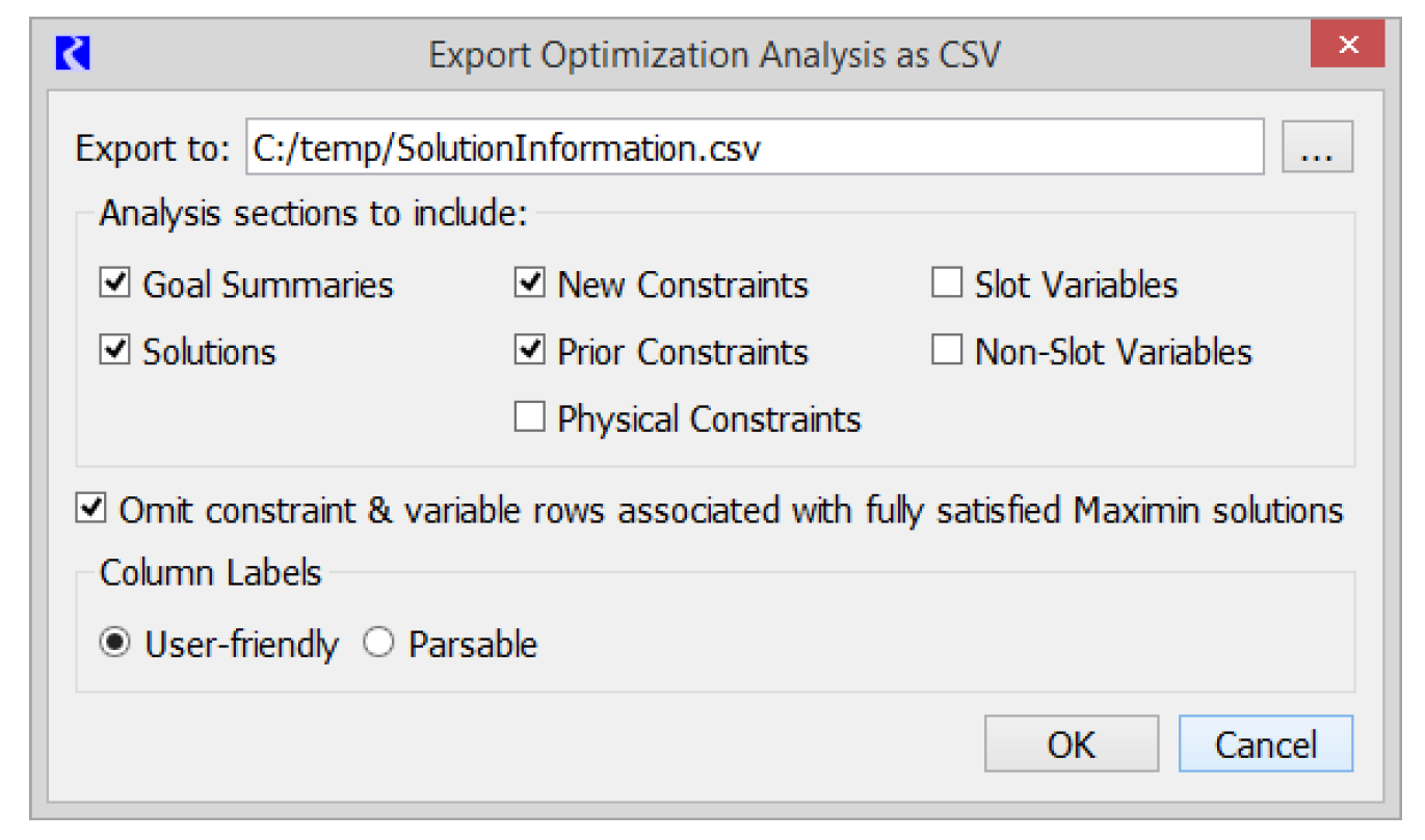 3. Specify whether to Omit constraint & variable rows associated with fully satisfied Maximin solutions. When checked, rows representing a fully satisfied solution are omitted.